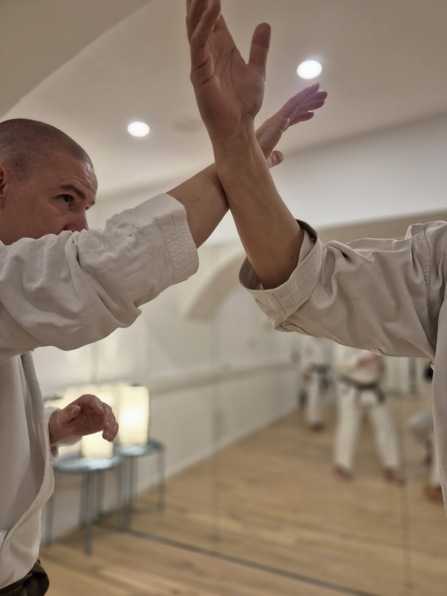 „Grundschule“ – einzelne Block- und Angriffstechniken aus den Kata üben wir isoliert oder in Kombination in hoher Wiederholungszahl, um sie auch spontan effizient einsetzen zu können.