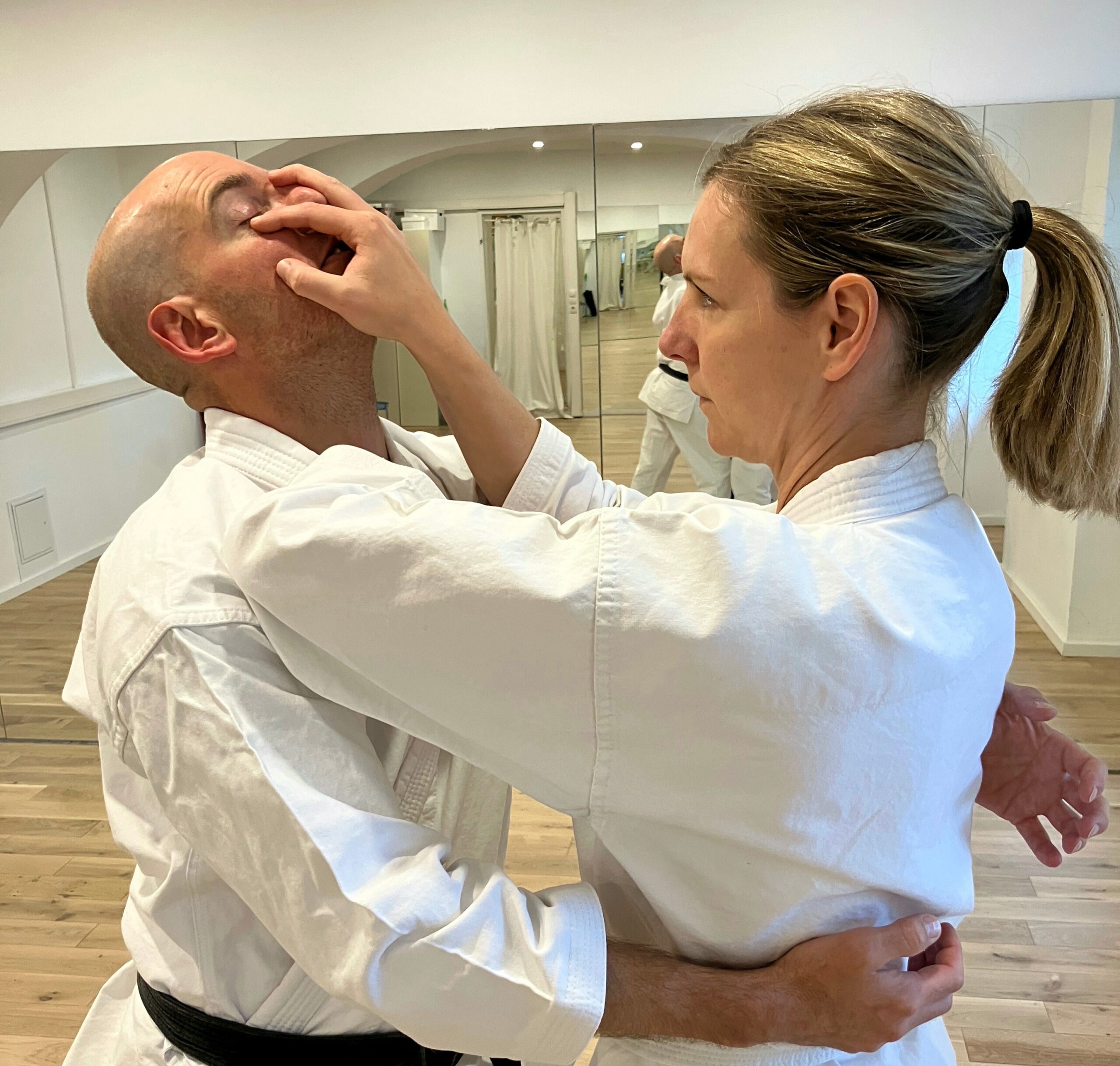 „Anwendung“ – mit einem Partner üben wir unterschiedliche Angriffsszenarien, wobei wir Blocks, Schläge, Tritte, Hebel und Würfe anwenden.